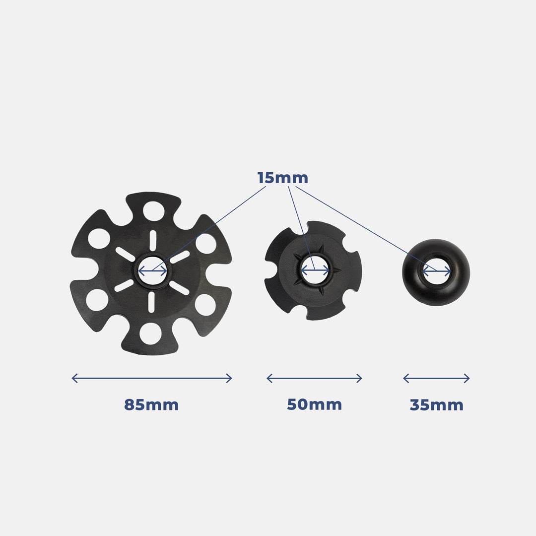 3 tamaños de arandelas compatibles con nuestros bastones de trail plegables.
