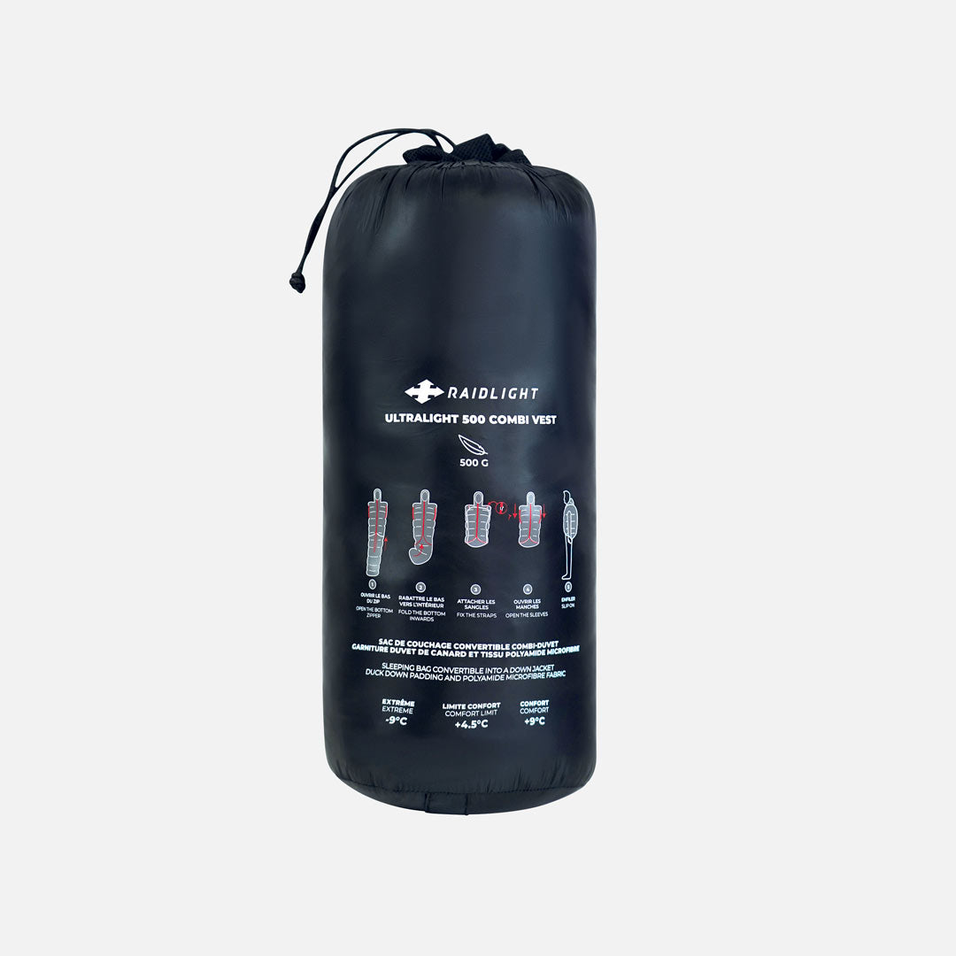 El saco de dormir Ultralight Down 2in1 permite utilizarlo de dos maneras: como saco para dormir y como chaleco de plumas. Es el saco de dormir más adaptable gracias a su versatilidad incorporada lo que te permite prescindir de una de las prendas para aligerar tu mochila dado que es el complemento ideal para carreras por desierto donde tienes que portar todo tu material, aventuras propias prescindiendo de hoteles, 'fastpacking' para ir ligero y rápido o 'bikepacking' para llevar lo menos posible siendo autosuficiente.